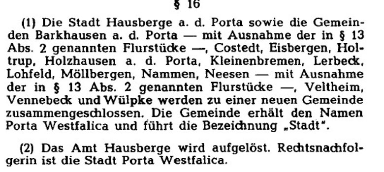 „Es entspricht dem Wunsch der Gemeinden, das neue Gemeinwesen mit dem markantesten Landschaftsteil dieses Raumes, der Porta Westfalica, auch namentlich zu verbinden. Diesem Wunsch sollte man entsprechen. Im Hinblick darauf, daß das Zentrum des Raumes, die Stadt Hausberge, seit altersher die Stadtrechte besitzt, solle auch die neue Gemeinde das Recht haben, die Bezeichnung ´Stadt` zu führen.“