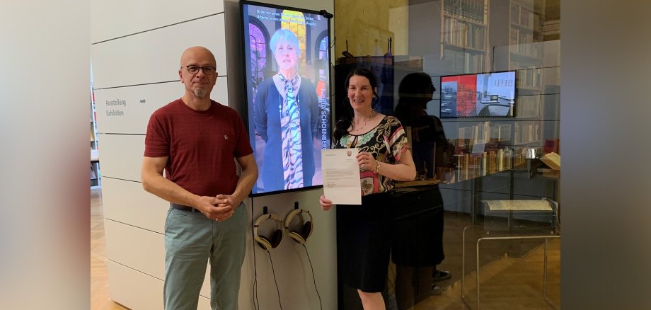 In dem rund einstündigen Gespräch berichten die Konrads u.a. über das 50jährige Bestehen der Stadt und die gute Entwicklung der Sparte Kunst an der Musikschule. Diese Entwicklung war ausschlaggebend für die Namensänderung. Die Idee der Bürgermeisterin, der Schule einen Beinamen zu geben, führte zur Auswahl von Arnold Schönberg, einem bedeutenden Komponisten, Musikpädagogen, Maler und Erfinder und damit direkt zum Arnold Schönberg Center in Wien, dem Hauptarchiv des Nachlasses von Schönberg.