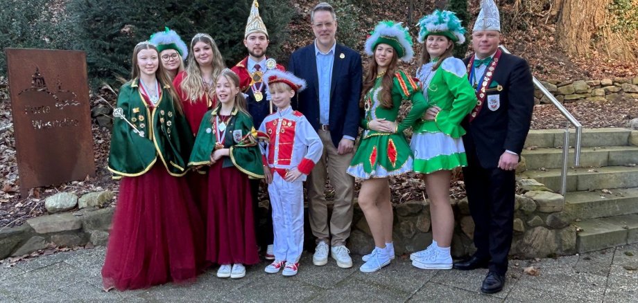 Am Rosenmontag, dem 03.03.2025, war die Karnevalsgesellschaft Grün-Rote Bütt zu Besuch im Rathaus. Der Erste Beigeordnete Carsten Dierks empfing Sitzungspräsident Kai Hohmeier und die Tollitäten Prinz Vincent I., Prinzessin Victoria I., Jugendprinzessin Emilia I., ihre Adjutantin Jette und Kinderprinzessin Mathi I. sowie Mitglieder der Tanzgarden.