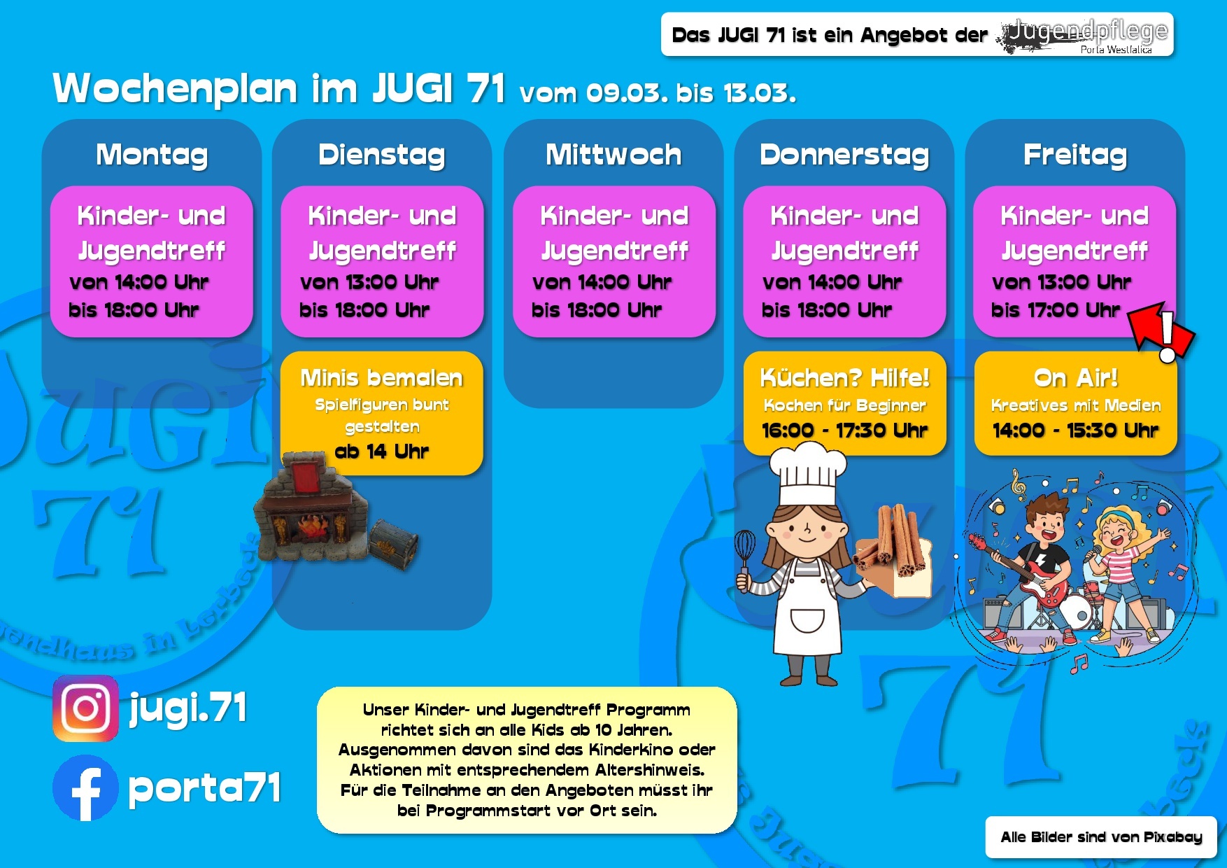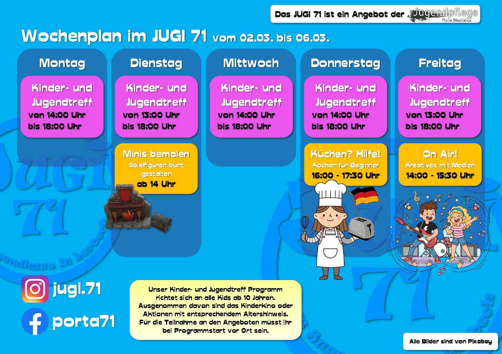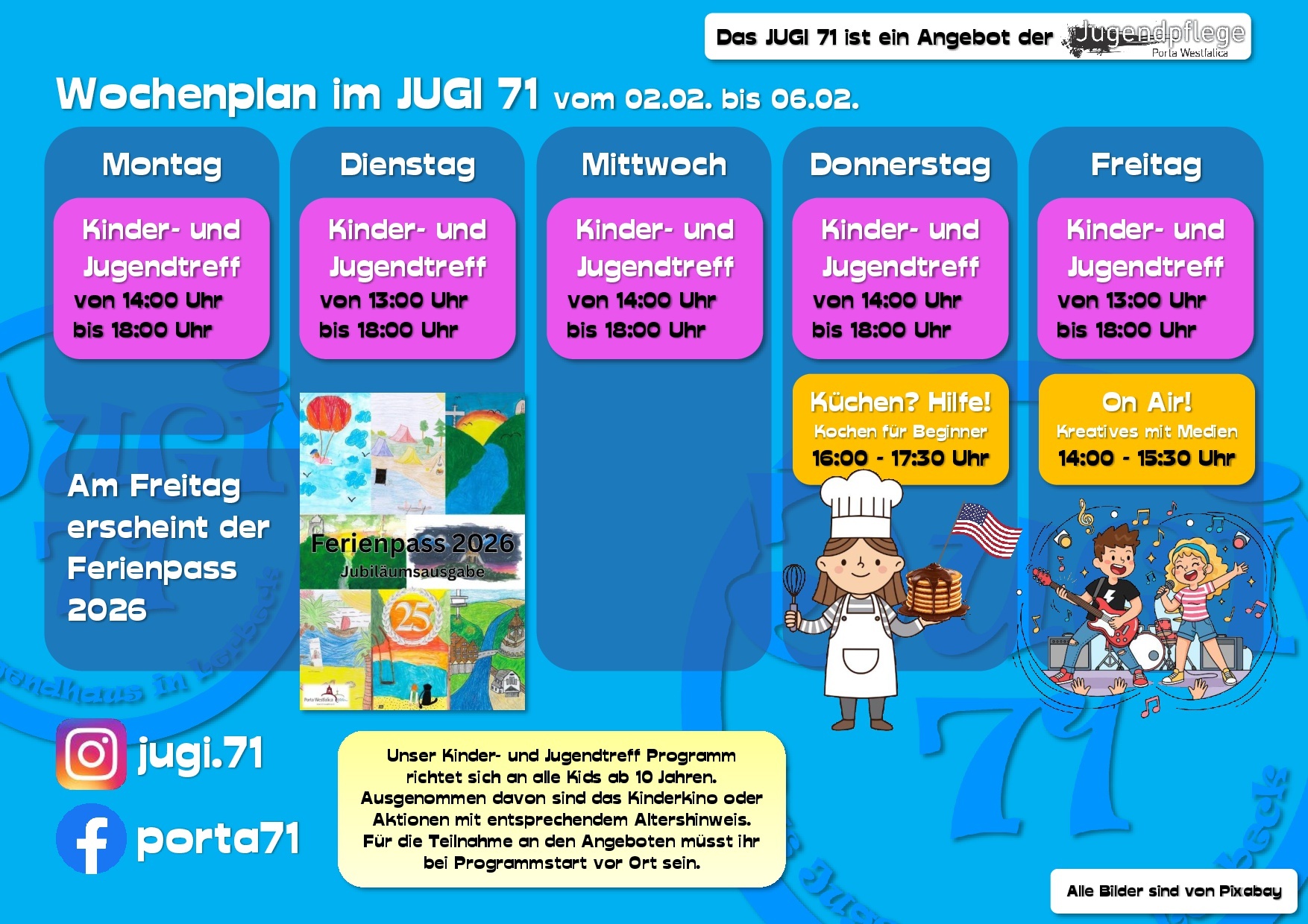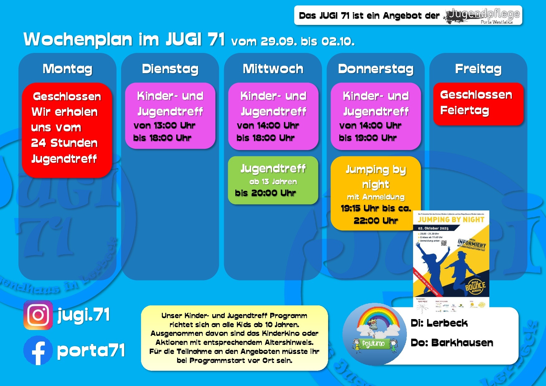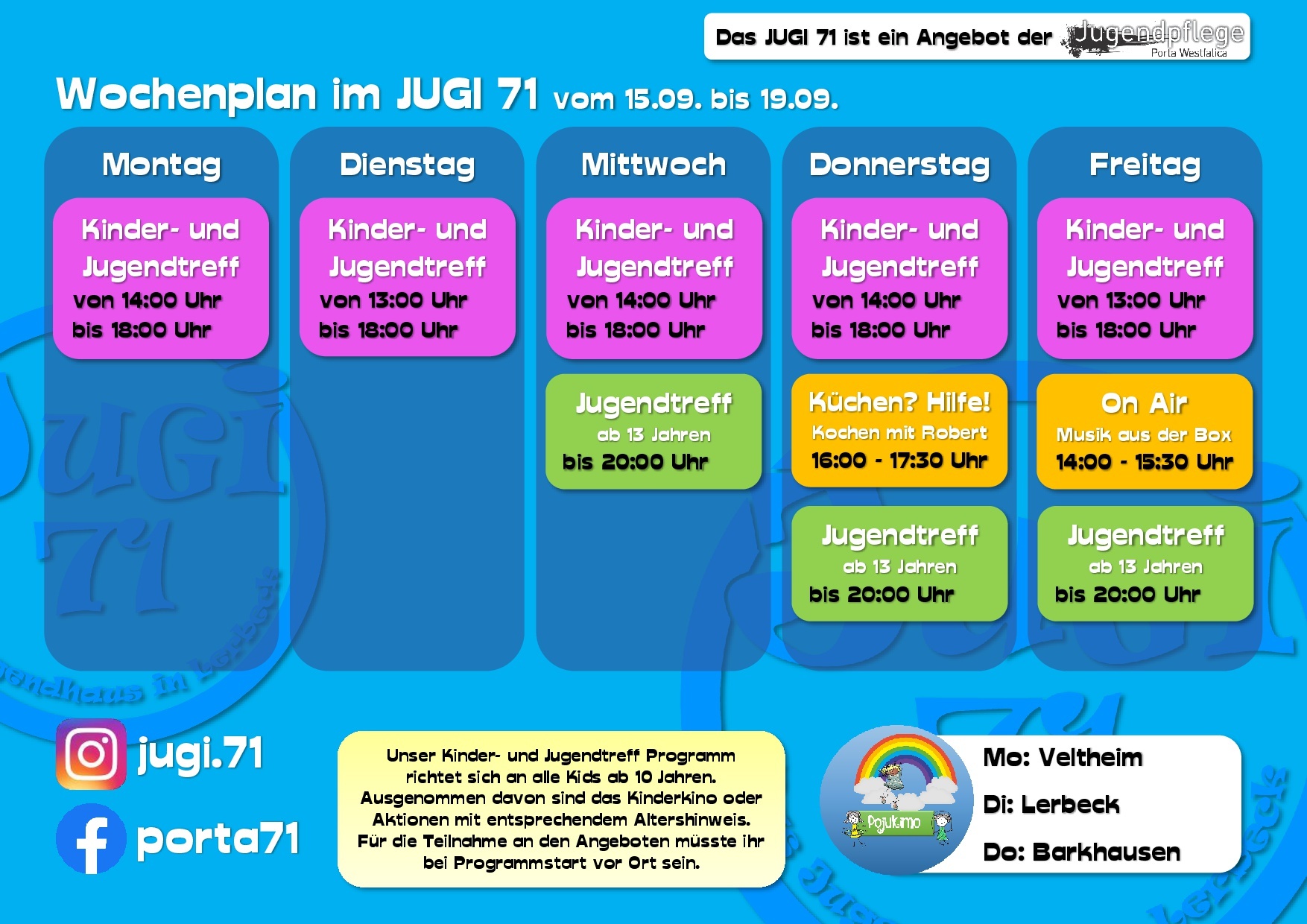 Hier erfährst Du vieles über uns, unsere Arbeit und unsere Termine. Dabei bleiben wir bitte beim „Du“, ok? Wir sind schließlich die Jugendpflege und somit in erster Linie für Kinder und Jugendliche in ganz Porta Westfalica da.