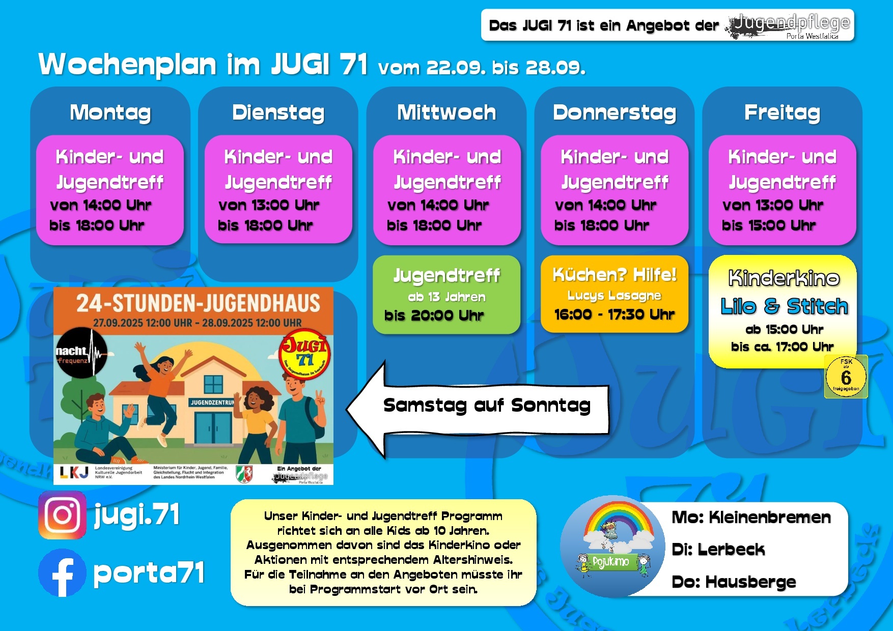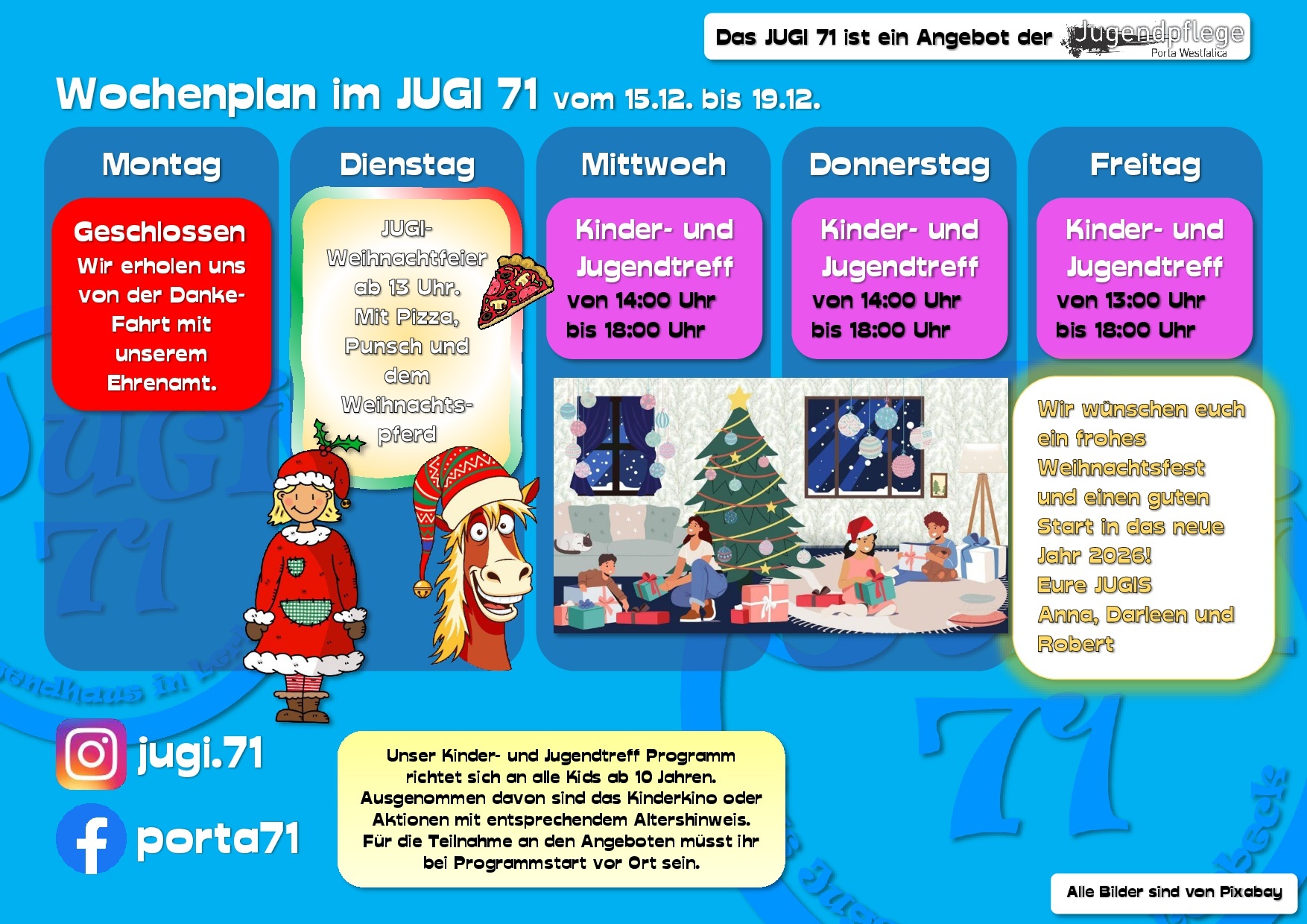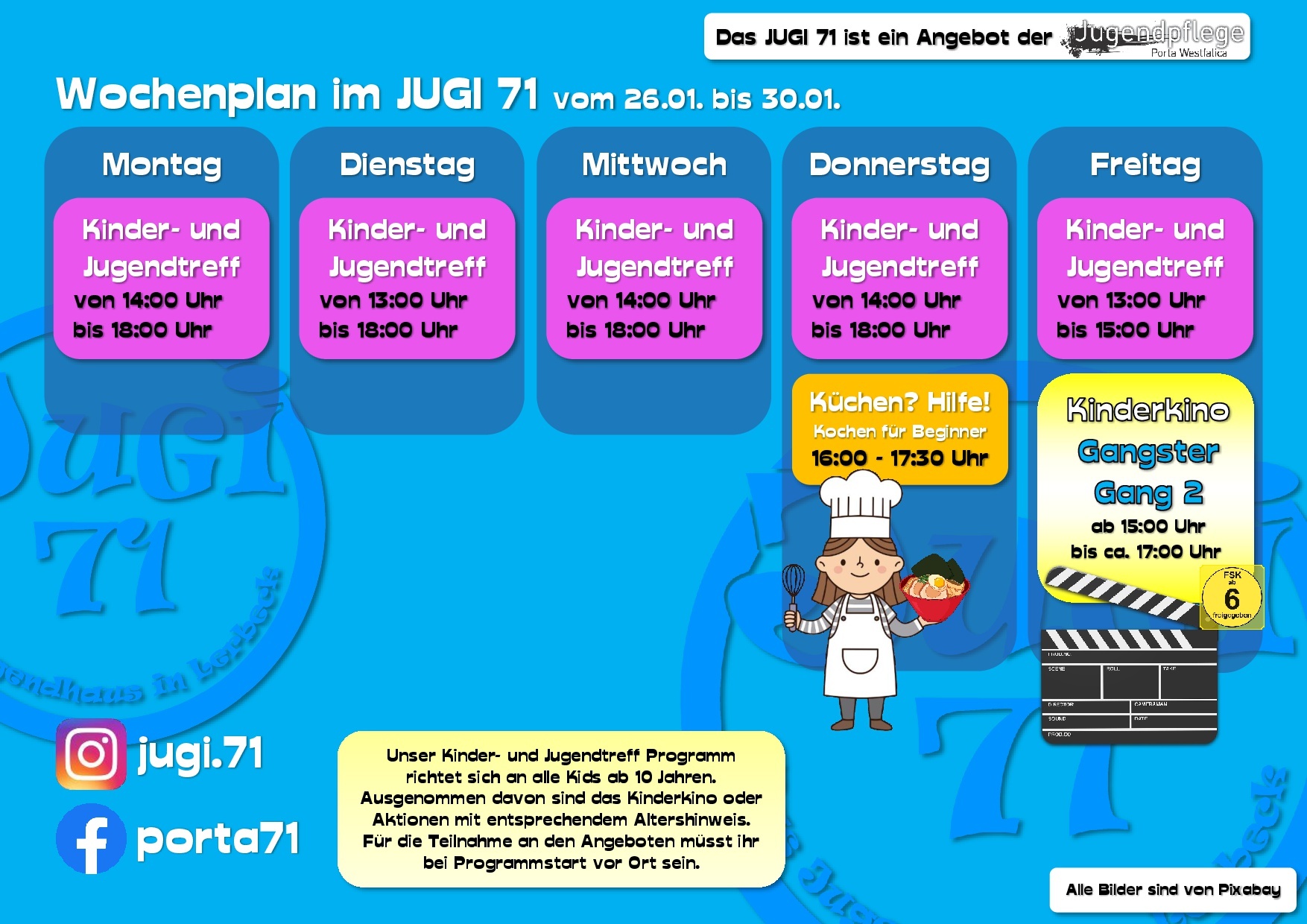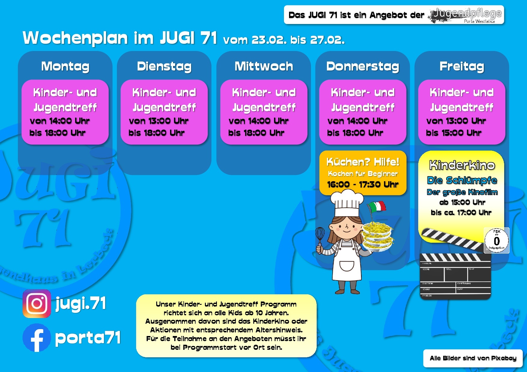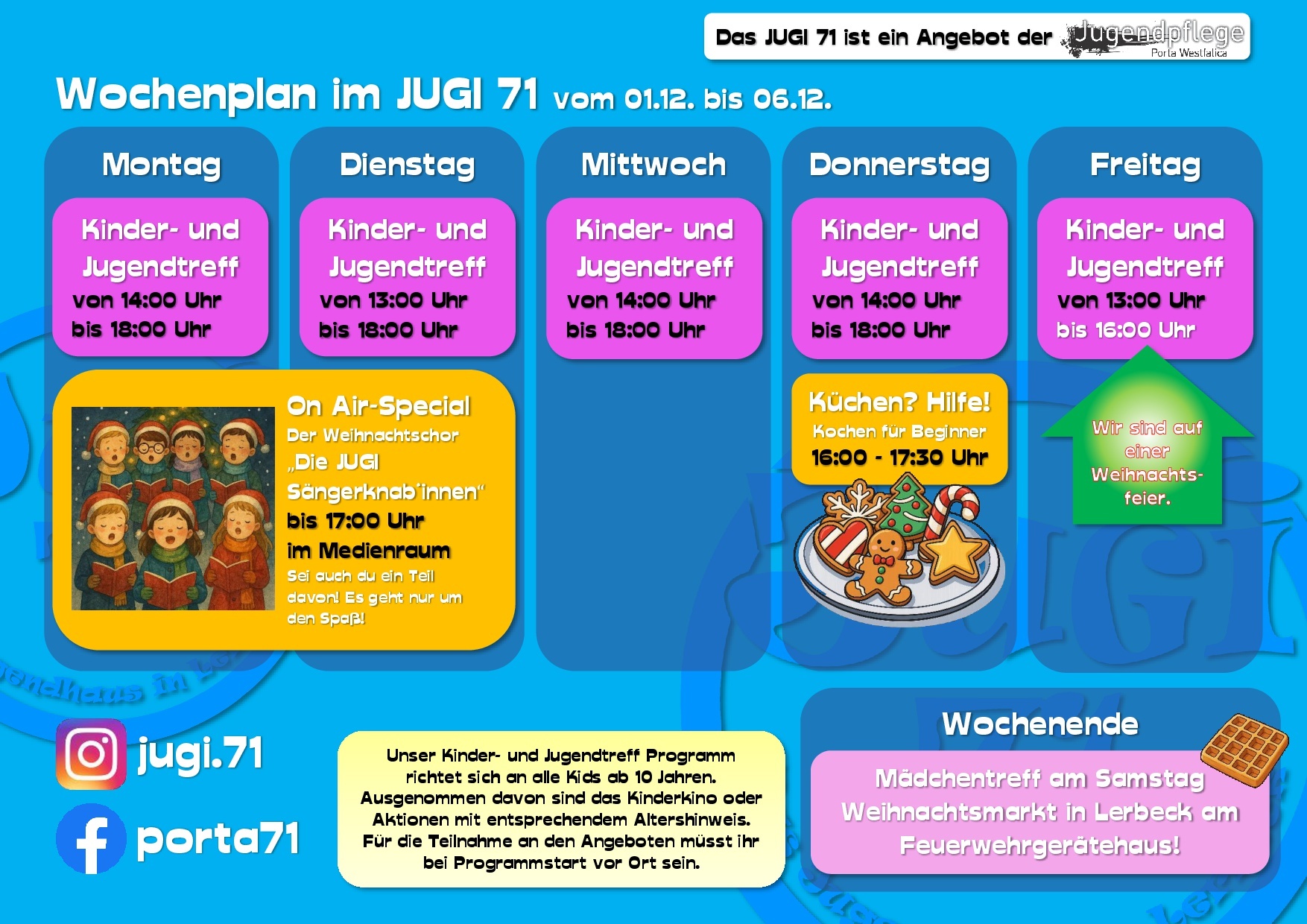 Hier erfährst Du vieles über uns, unsere Arbeit und unsere Termine. Dabei bleiben wir bitte beim „Du“, ok? Wir sind schließlich die Jugendpflege und somit in erster Linie für Kinder und Jugendliche in ganz Porta Westfalica da.