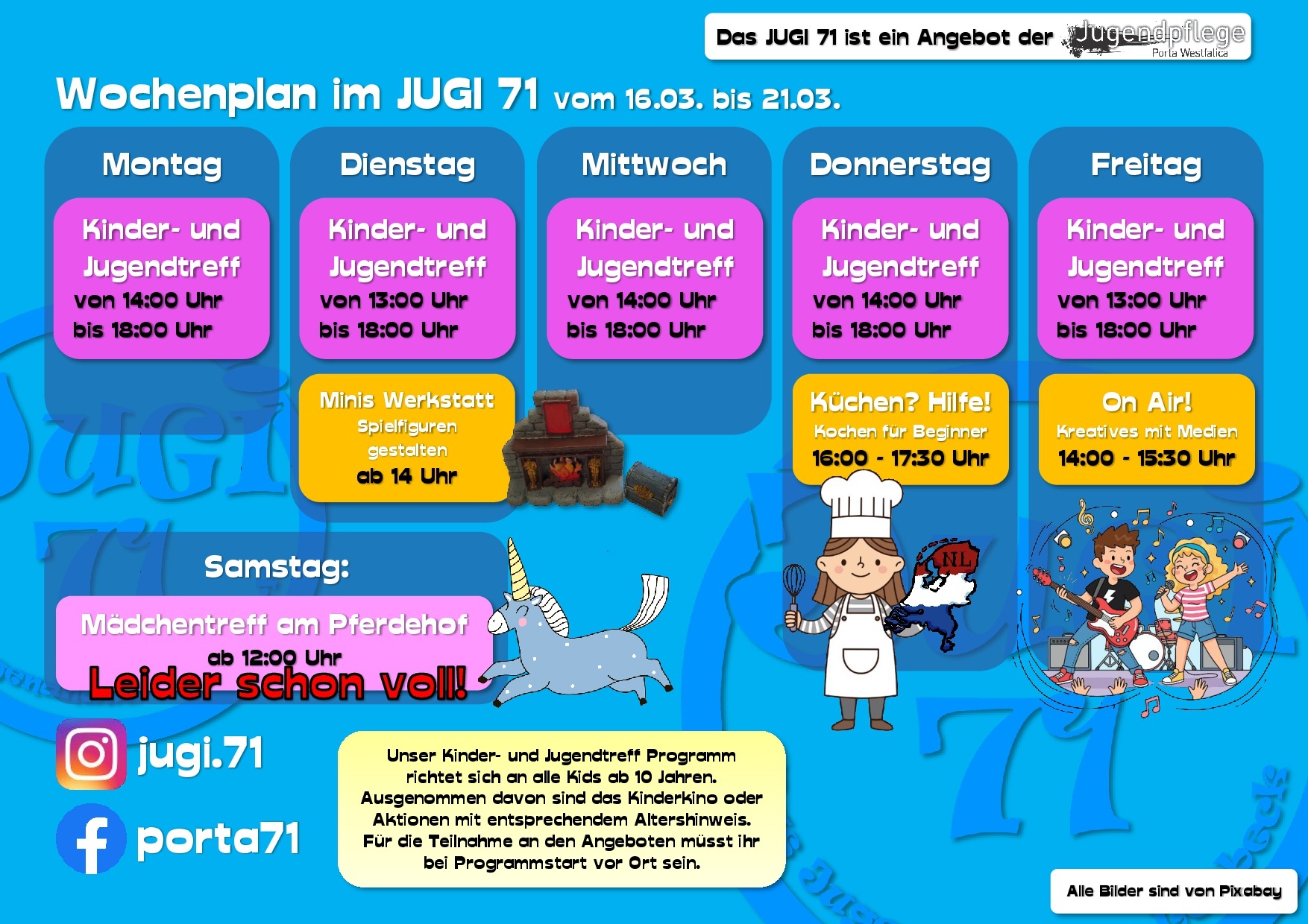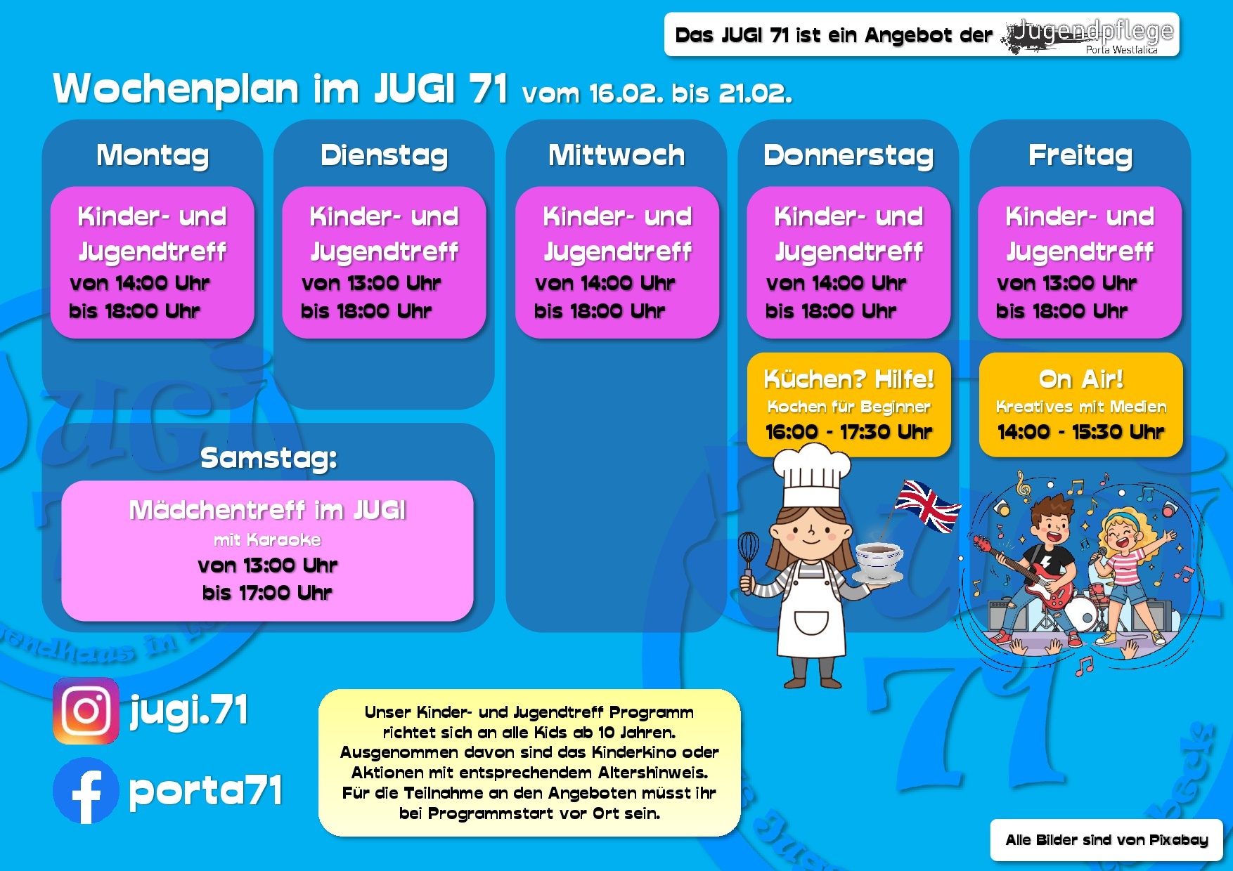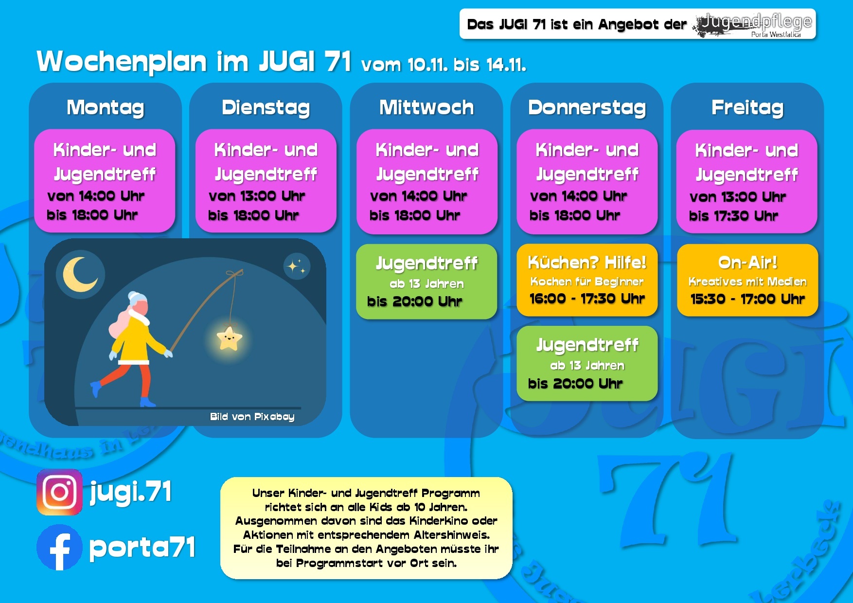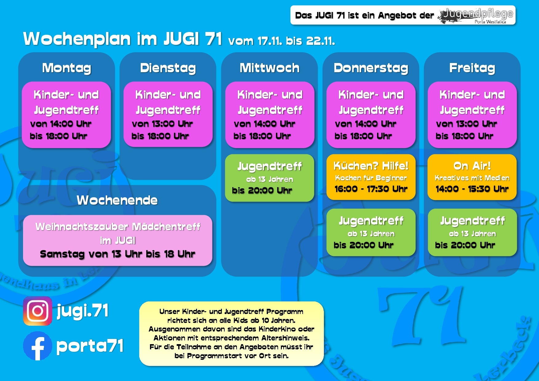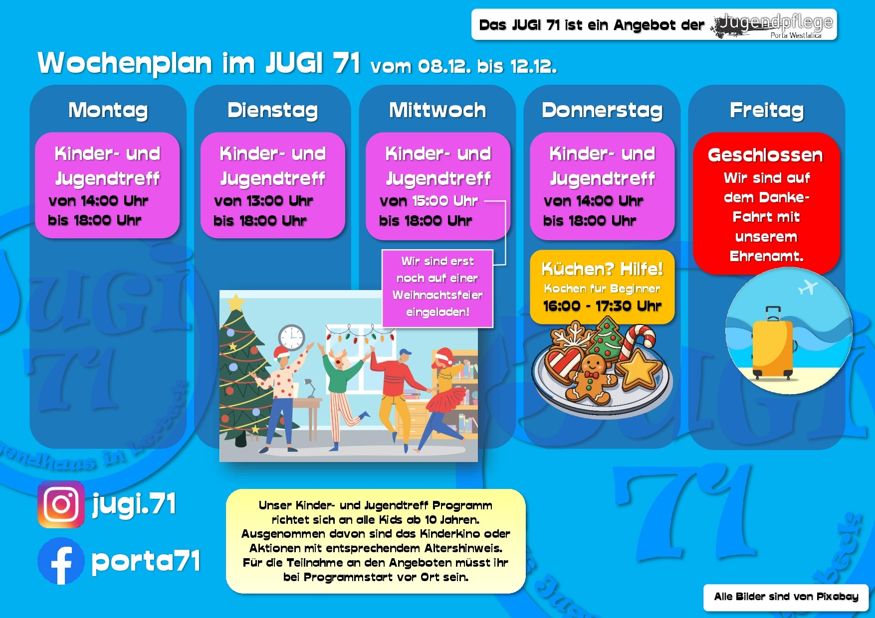 Hier erfährst Du vieles über uns, unsere Arbeit und unsere Termine. Dabei bleiben wir bitte beim „Du“, ok? Wir sind schließlich die Jugendpflege und somit in erster Linie für Kinder und Jugendliche in ganz Porta Westfalica da.
