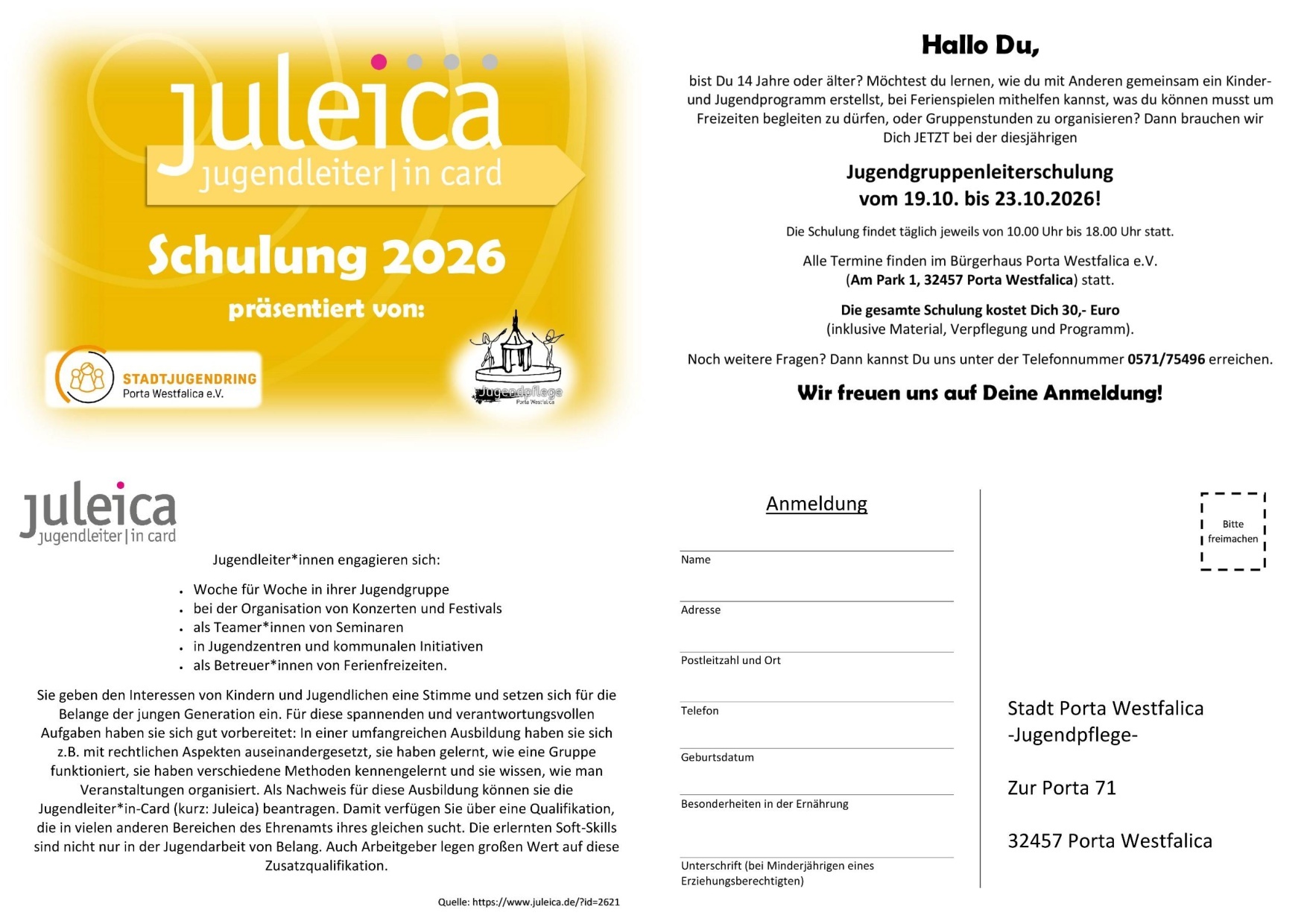 Flyer und Anmeldungen gibt es ab hier auf der Homepage und ab den Sommerferien in allen weiterführenden Schulen in Porta, im Rathaus und natürlich bei uns im JUGI.